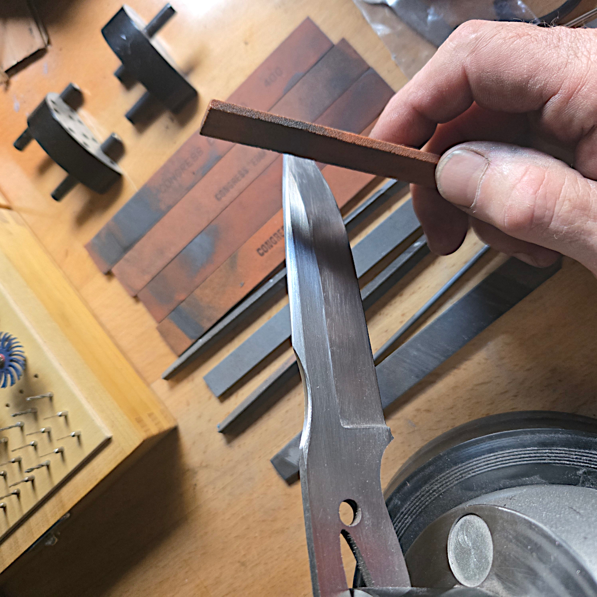 Blade smithing in my studio is rooted in heirloom techniques—files, stones, and hand‑scraping. These traditional methods demand patience and precision, but they produce an exceptional level of finish and accuracy that modern shortcuts